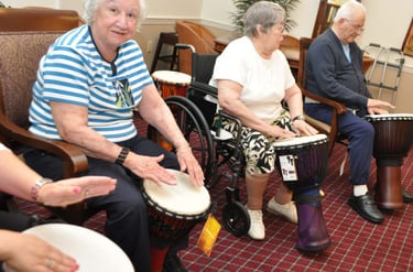 Drumming isn’t just music—it’s therapy, movement, and laughter all in one. Our workshops are designed to boost mood, encourage gentle exercise, and create a sense of belonging among residents. Scientific studies show group drumming can reduce stress, improve memory, and enhance overall wellbeing.